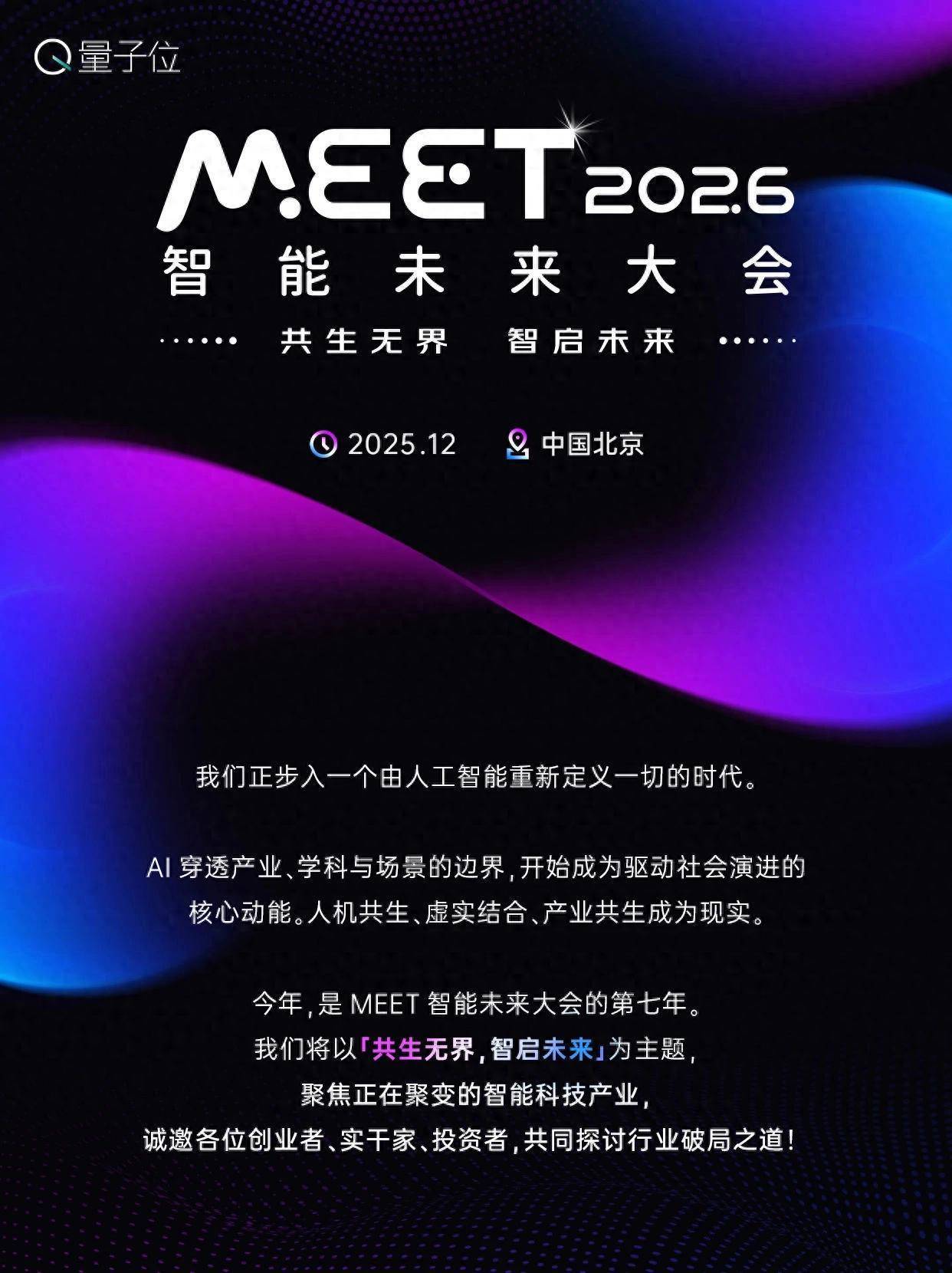量子位的答案是,MEET智能未来大会。 来看看我们的“朋友圈”这里既有李开复、张亚勤等产业大咖,也有倪光南、谭建荣、李培根、郑纬民、周志华、唐杰等学术领路人,更汇聚了来自百度、阿里、腾讯、华为、京东、美团、小米、商汤等公司的实干家与新星。️ 今年我们聊什么?话题覆盖:人工智能+、AI Infra、智能终端、智能驾驶、低空经济、能源电力... 总之,前沿的我们都聊。 我们想邀请谁?当然是你!我们希望汇聚更多技术、产业、投资领域的同行者,一起搞点大事情。 同期重磅发布#量子位人工智能年度榜单(五大奖项征集中,速来!) 报名链接:https://wj.qq.com/s2/23740133/iso8/#量子位2025年度AI十大趋势报告(揭秘十大潜力股,剖析代表案例)作为智能科技的年度风向标,MEET大会每年都吸引:上千人现场参与、百万人线上围观、近百家媒体曝光。 所以,今年12月,北京见吗?来 #MEET智能未来大会 共论破局之道,共赴智能新未来!